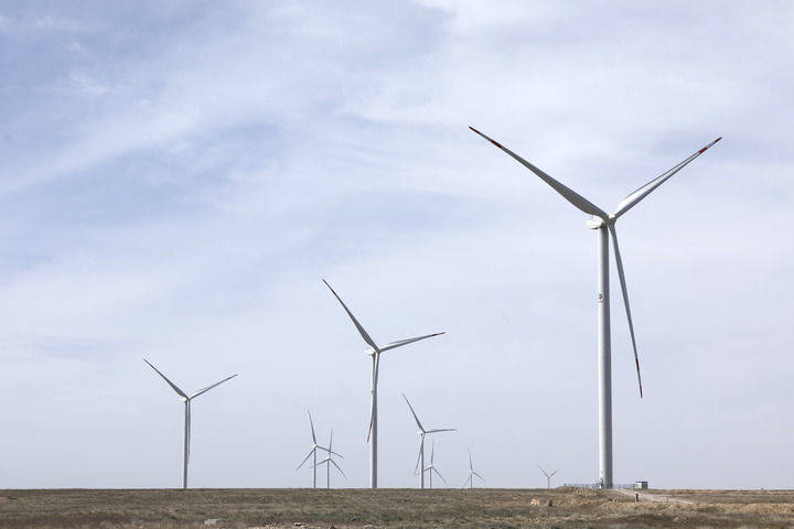這是2023年4月3日在哈薩克斯坦札納塔斯拍攝的札納塔斯100兆瓦風電項目風機。新華社發(奧斯帕諾夫攝)
