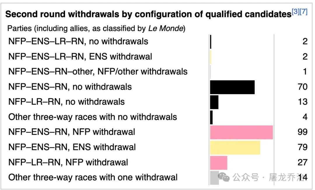 此外,在新人民陣線、共和黨(老牌中右翼)、國民聯盟三方對決的40個選區中,新人民陣線在27個選區退出第二輪選舉。