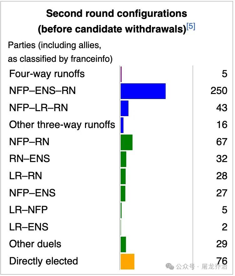 第一輪投票結果的確如此:由於今年選舉投票率極高(兩輪投票率都超過66%),只有76名候選人一輪直接當選;第二輪選舉中有306個選區將是三人競爭(其中250個是“左中右”對決),還有5個選區是四人競爭。