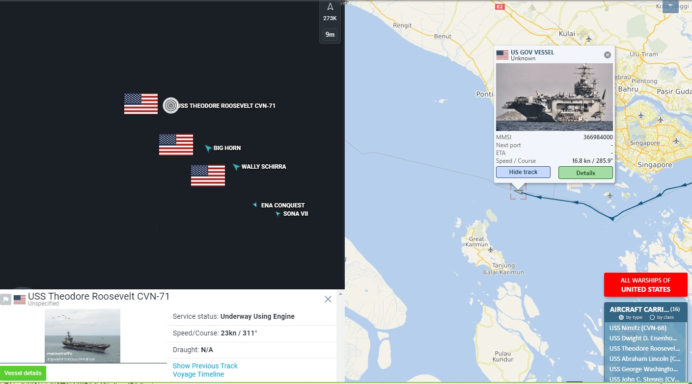 AIS顯示“羅斯福”號通過馬六甲海峽(上圖)美軍各艦隊的部署位置