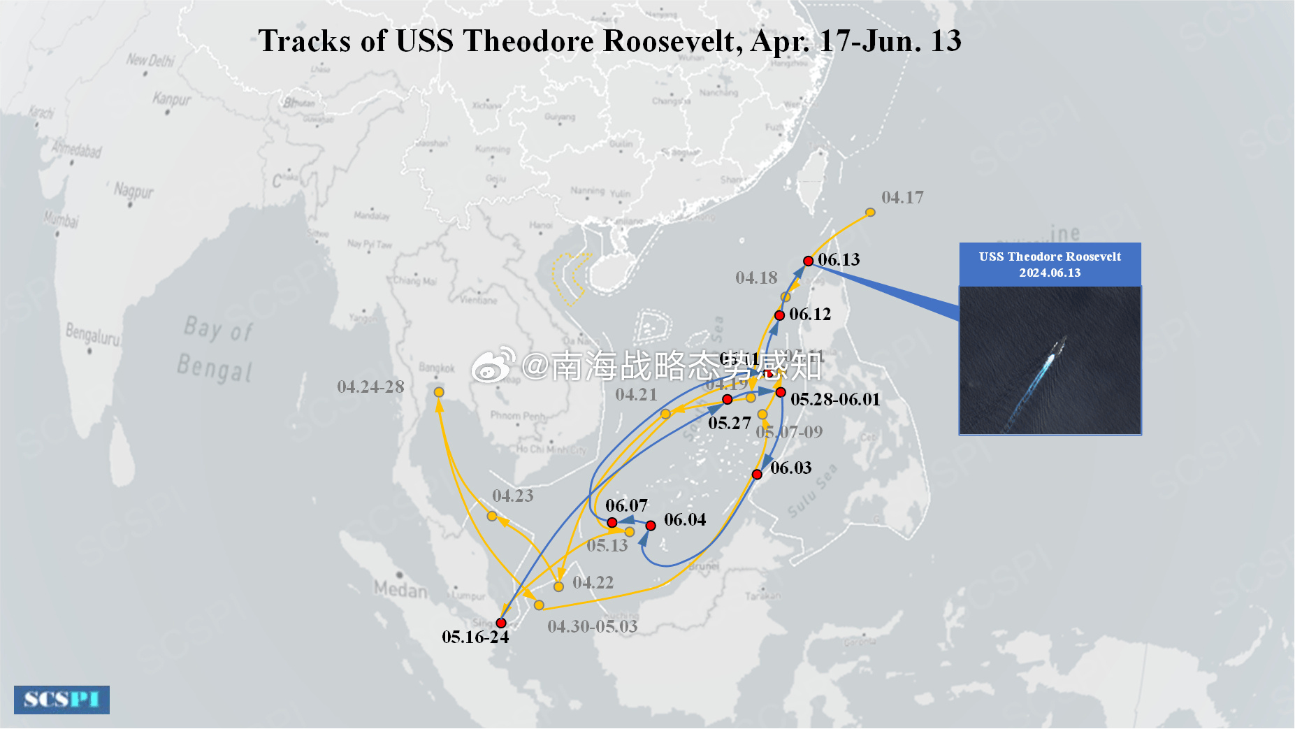在本次部署期間,“羅斯福”號航母在3月份和4月份長期在南海活動,活動時間達到了創紀錄86天,並與日本,菲律賓頻繁舉行了多次演習,多次抵近我方島礁,擾動南海局勢的意圖明顯。@南海戰略態勢感知稱,自4月18日經巴士海峽進入南海活動,“羅斯福”號航母打擊羣此次南海部署時間長達58天,是近年來美軍航母打擊羣南海活動時間最長的一次。