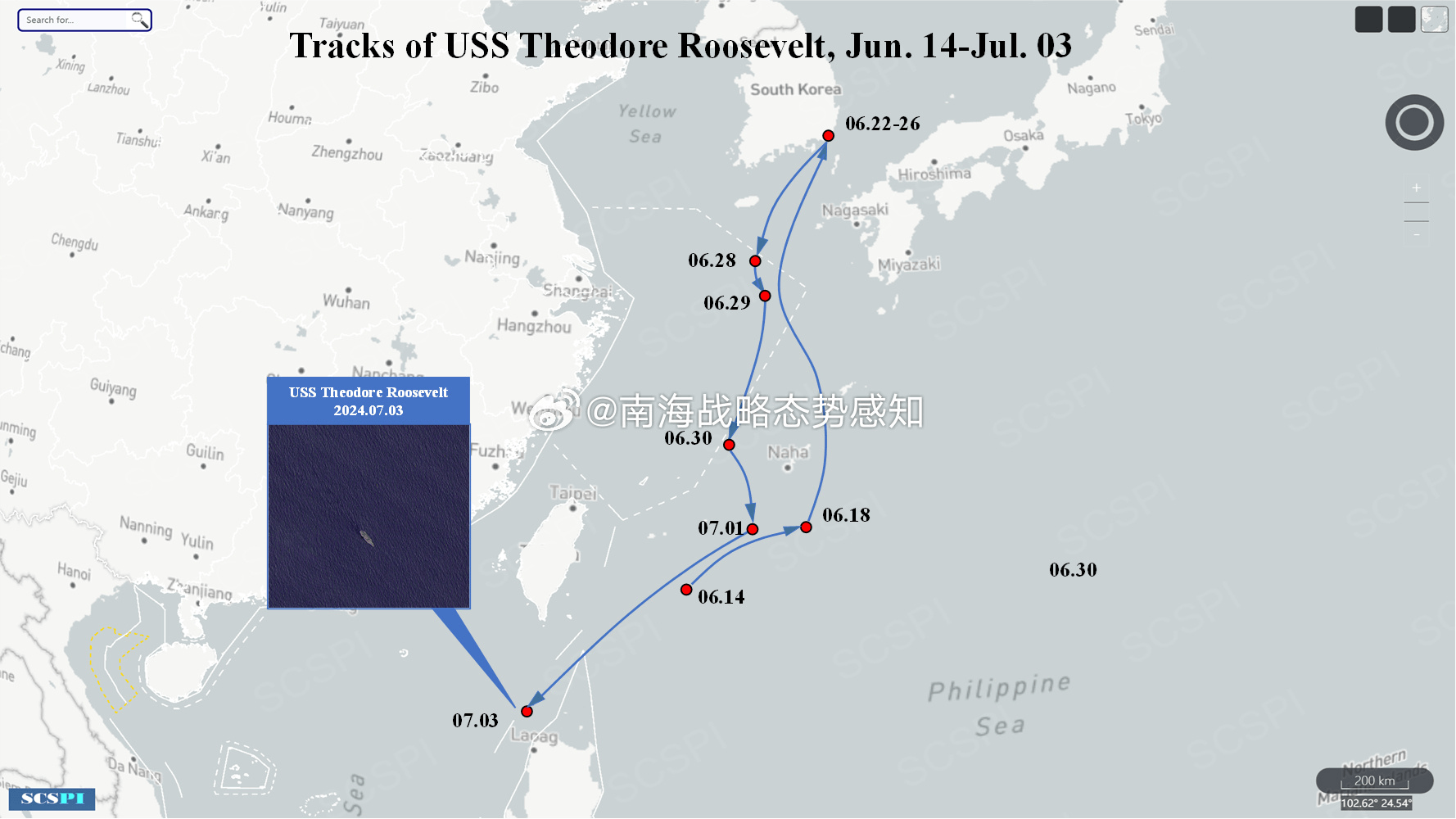進入6月份,“羅斯福”號航母一直在日韓方向活動,6月22日,美國海軍“羅斯福”號核動力航母抵達韓國南部釜山。