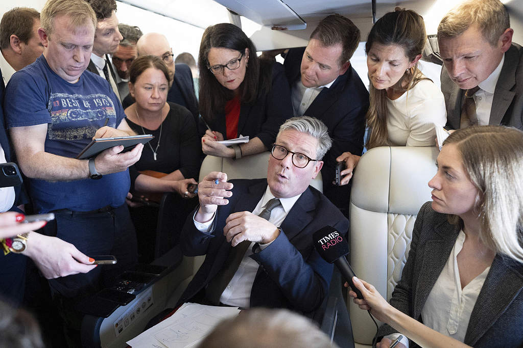 當地時間2024年7月9日,英國倫敦斯坦斯特德機場,英國首相斯塔默在飛往華盛頓的飛機上與記者交談。視覺中國