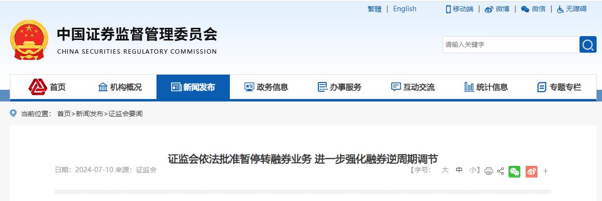 7月10日,中國證券監督管理委員會網站消息,為切實回應投資者關切,維護市場穩定運行,經充分評估當前市場情況,**證監會依法批准中證金融公司暫停轉融券業務的申請,自2024年7月11日起實施。**存量轉融券合約可以展期,但不得晚於9月30日了結。同時,批准證券交易所將融券保證金比例由不得低於80%上調至100%,私募證券投資基金參與融券的保證金比例由不得低於100%上調至120%,自2024年7月22日起實施。