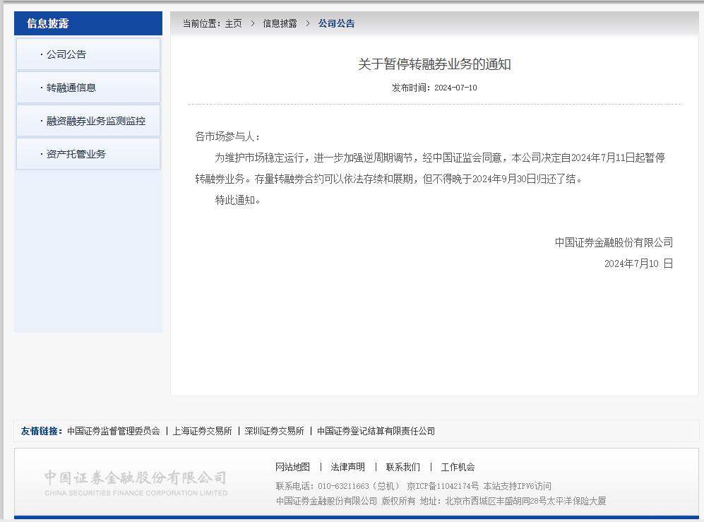 中國證券金融股份有限公司發佈通知,為維護市場穩定運行,進一步加強逆週期調節,經中國證監會同意,公司決定自2024年7月11日起暫停轉融券業務。存量轉融券合約可以依法存續和展期,但不得晚於2024年9月30日歸還了結。