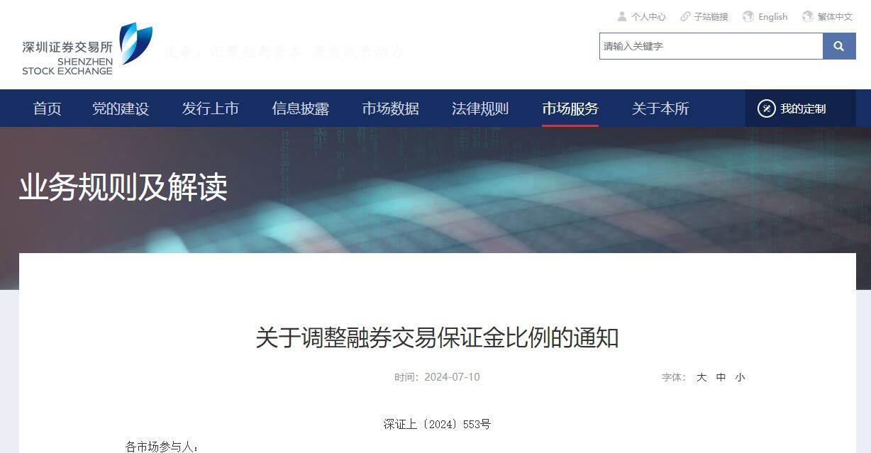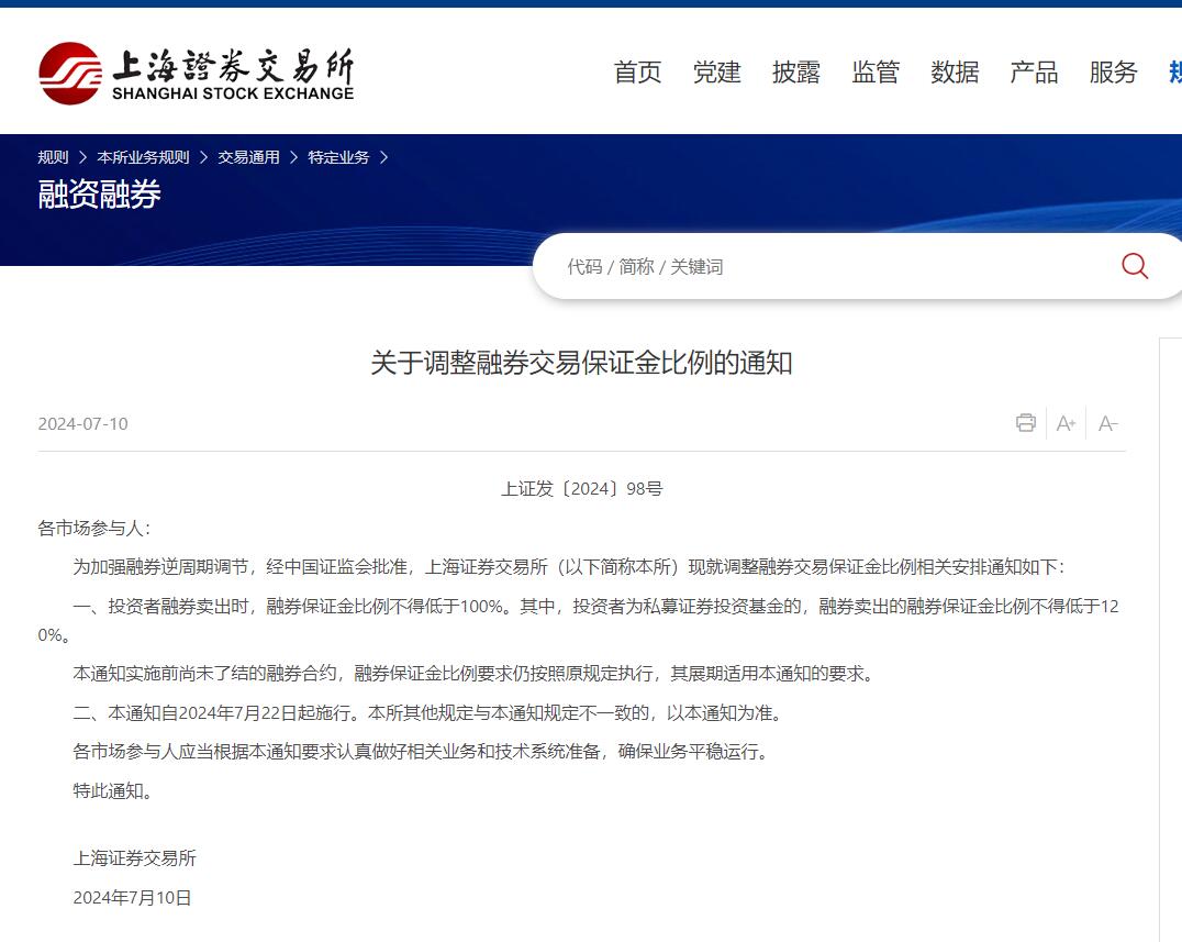 7月10日,上交所、深交所發佈調整融券交易保證金比例的通知,投資者融券賣出時,融券保證金比例不得低於100%。其中,投資者為私募證券投資基金的,融券賣出的融券保證金比例不得低於120%。本通知實施前尚未了結的融券合約,融券保證金比例要求仍按照原規定執行,其展期適用本通知的要求。通知自2024年7月22日起施行。