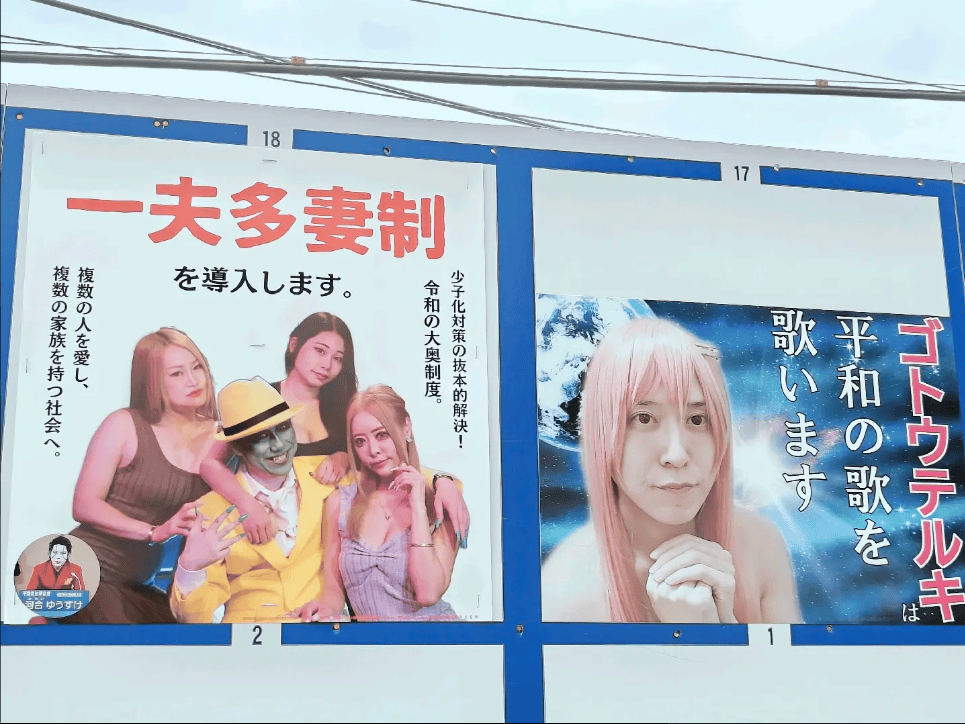 就是這麼一次重要的選舉,卻出現了始料未及的羣魔亂舞現象。選舉中,有56位候選人報名參選,達到歷史之最。但問題是,其中大半的候選人並不是奔着成為東京都知事而去的,他們懷着各種各樣的目的,主要歸納為以下:賺人氣,單純賺錢,以及噁心別人。
