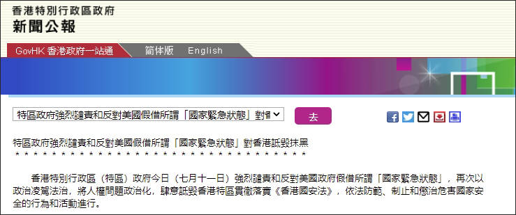 香港特別行政區政府7月11日發佈新聞公報,強烈譴責和反對美國政府假借所謂“國家緊急狀態”,再次以政治凌駕法治,將人權問題政治化,肆意詆譭香港特區貫徹落實《香港國安法》,依法防範、制止和懲治危害國家安全的行為和活動進行。