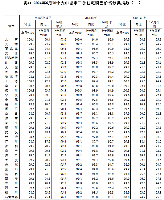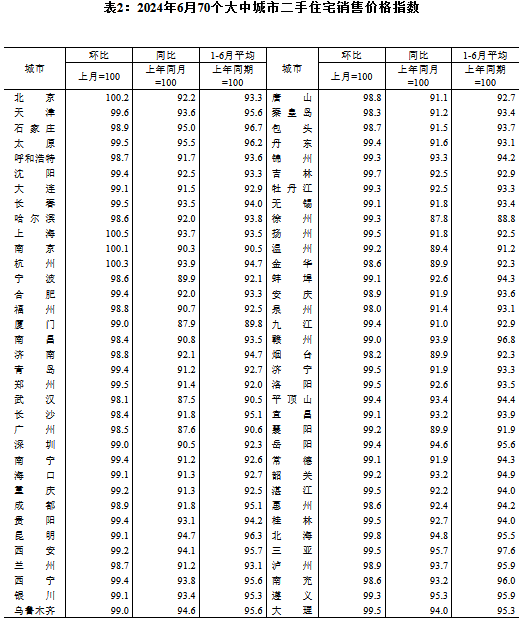 據國家統計局網站7月15日消息,2024年6月份,70個大中城市中,各線城市商品住宅銷售價格環比降幅總體收窄;同比下降,其中一線城市二手住宅同比降幅收窄。