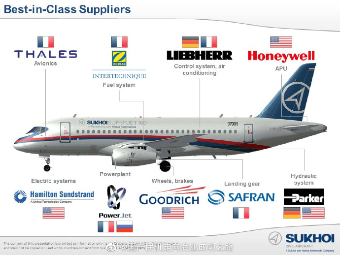 作為採用了全球主流的“主製造商——供應商”模式研發的SSJ-100,其使用了大量的西方成熟貨架產品與子系統。毫無疑問,這些所使用的西方設備無一不在制裁清單上。如果説空客波音的飛機由於全球用户非常多還能“各顯神通”,那SSJ-100真就是僅有俄羅斯在主要使用,而且全都是專用件,想找人勻一下都沒得勻。