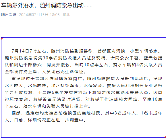 微信公眾號“隨州消防”消息,7月14日7時左右,隨州消防接到報警稱,曾都區府河鎮一小型車輛落水。隨州消防緊急調集30餘名消防救援人員趕赴現場,會同公安幹警、藍天救援隊和周邊幹部羣眾一同展開搜救。當晚10點半左右,落水車輛和4名失聯人員全部被打撈上岸,人員均已無生命體徵。