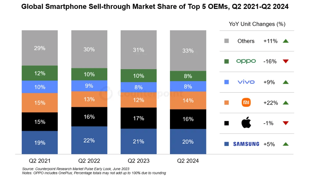 Counterpoint Research報告也分析稱,OPPO因中國等主要市場競爭激烈而導致出貨量下降,但OPPO近年來專注於提高盈利能力,優先考慮價值而非出貨量,包括髮布更多中高端價位段的產品等,以一致化其高端化的戰略。這一選擇或許會在短期內對其市場份額帶來挑戰,但長遠來看能為品牌帶來更好的盈利能力。