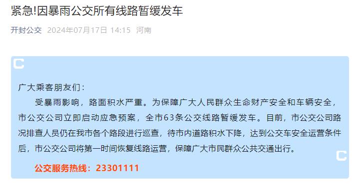 7月17,“開封公交”公眾號日發佈通告稱,受暴雨影響,路面積水嚴重。為保障廣大人民羣眾生命財產安全和車輛安全,市公交公司立即啓動應急預案,全市63條公交線路暫緩發車。目前,市公交公司路況排查人員仍在我市各個路段進行巡查,待市內道路積水下降,達到公交車安全運營條件後,市公交公司將第一時間恢復線路運營,保障廣大市民羣眾公共交通出行。