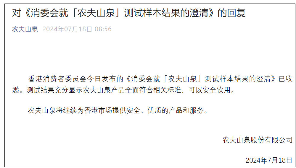 同日,微信公眾號“農夫山泉”對此回覆稱:“香港消費者委員會今日發佈的《消委會就‘農夫山泉’測試樣本結果的澄清》已收悉。測試結果充分顯示農夫山泉產品全面符合相關標準,可以安全飲用。農夫山泉將繼續為香港市場提供安全、優質的產品和服務。”