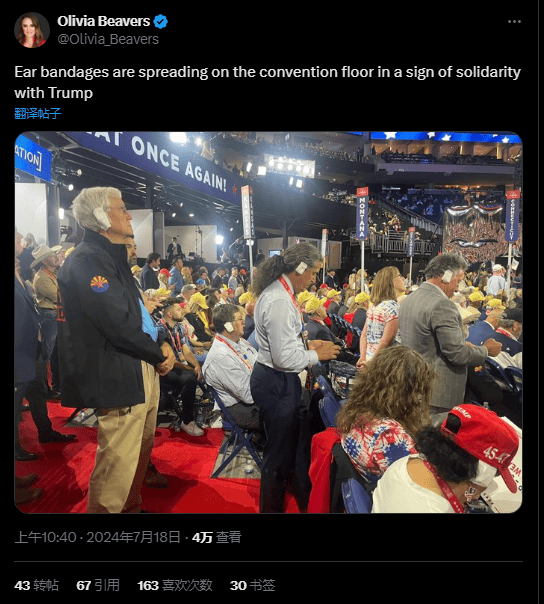 當地時間7月17日,美國政治新聞網(Politico)記者奧利維亞·比威爾斯(Olivia Beavers)在社交媒體平台發佈在美國共和黨全國代表大會會場拍攝的照片。照片中,許多參會者都包紮右耳,模仿此前遭槍擊而受傷的美國前總統特朗普。