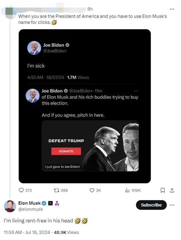 17日晚些時間,馬斯克在一名網友諷刺拜登“利用埃隆·馬斯克的名字炒作”的評論底下回複道,“我在他腦海裏揮之不去(直譯為,我免費住在他的腦子裏)”並配上了兩個“笑哭”的表情包。