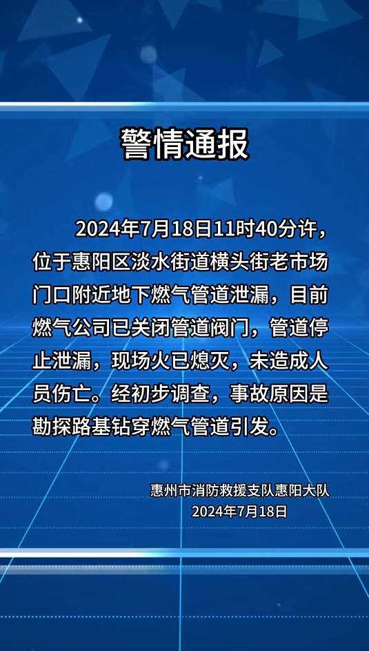 惠州市消防救援支隊微信視頻號“惠州消防”發佈警情通報稱,當天11時40分許,位於惠陽區淡水街道橫頭街老市場門口附近地下燃氣管道泄漏。