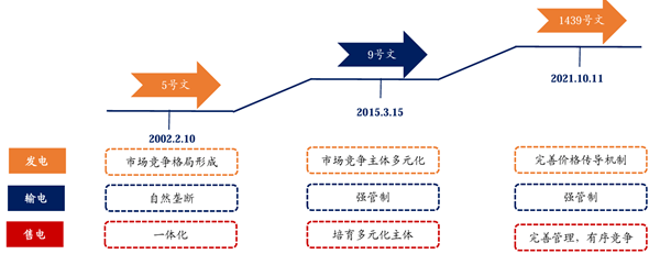 國內歷史上經歷了三輪電力體制改革,市場逐步替代計劃成為電力資源配置的主要手段。當前,我國提出建立以新能源為主體的新型電力體系,加快建設全國統一電力市場。