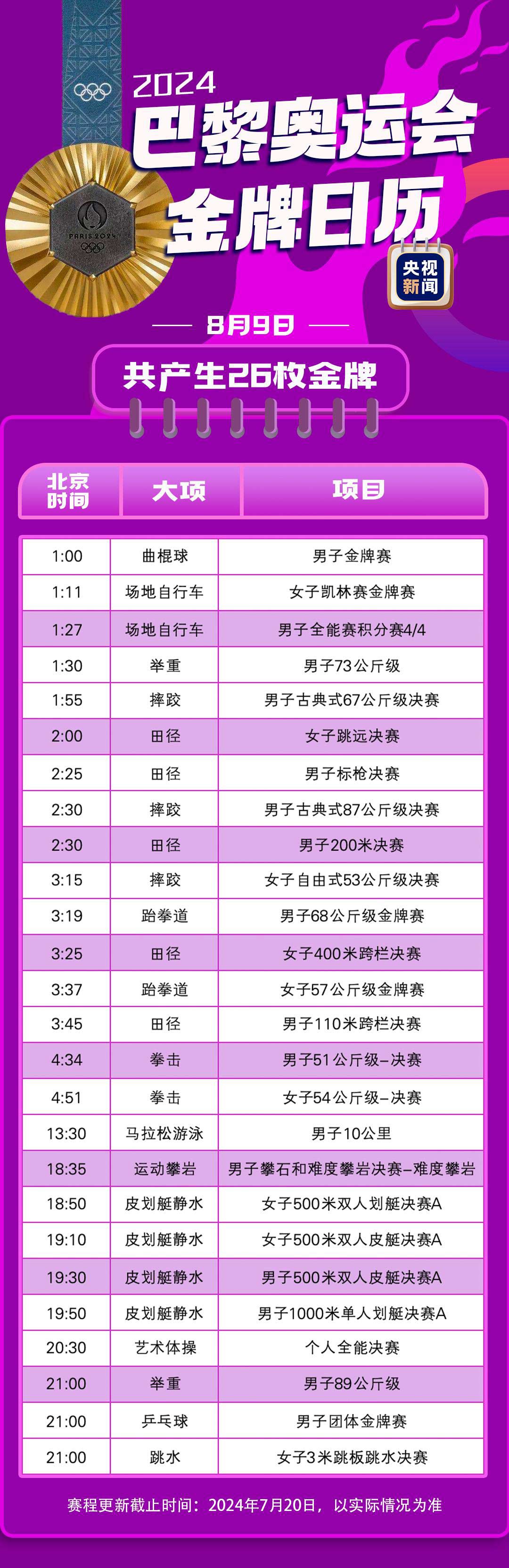 還有不到一週的時間,快收藏這份最新金牌觀賽日曆,共同期待精彩的奧運賽事。