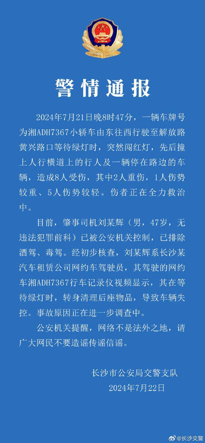 2024年7月21日晚8時47分,一輛車牌號為湘ADH7367小轎車由東往西行駛至解放路黃興路口等待綠燈時,突然闖紅燈,先後撞上人行橫道上的行人及一輛停在路邊的車輛,造成8人受傷,其中2人重傷,1人傷勢較重、5人傷勢較輕。傷者正在全力救治中。