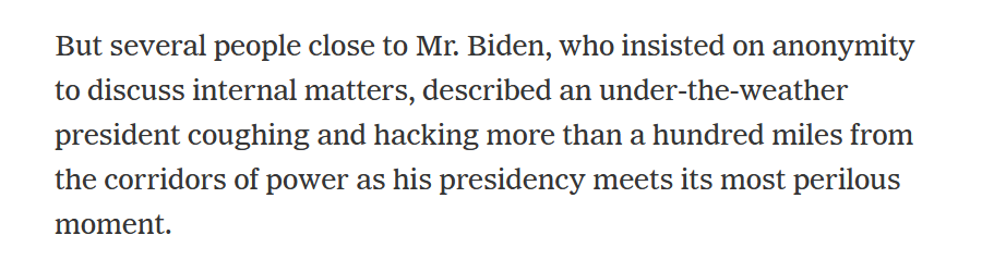 “一些希望保持匿名的拜登身邊的人,描述了一個身體不適的總統,在離權力中心百里之外的地方正在不停地痛苦咳嗽,而他的總統任期到了最危險的時刻……”
