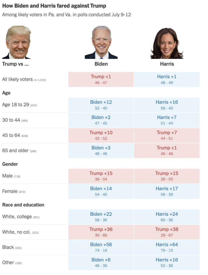 如在搖擺州賓夕法尼亞和弗吉尼亞,哈里斯的民調錶現甚至比拜登好一些