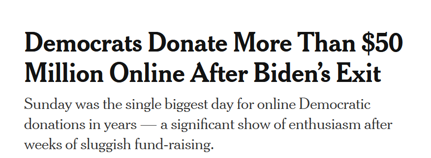民主黨從上到下有很多人,他們是真的不想看到拜登繼續選下去,不管是嫌棄拜登能力不行、年齡太大,還是厭惡拜登帶來的通脹,還是反感拜登在巴勒斯坦問題上的立場或者是拜登兒子的犯罪問題……哈里斯是有希望吸收這些原本不願意支持拜登的金主和選民的。所以你看拜登一退選,民主黨馬上收到了創紀錄的政治募捐,就是這種“只要不是拜登,誰上都好”的情緒反映。