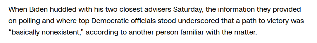 當然,最直接的原因,從一些媒體報道上看(比如下面CNN的報道),是拜登在這週末終於接受了親信給他看的真實民調數據,意識到自己差距太大根本贏不了。