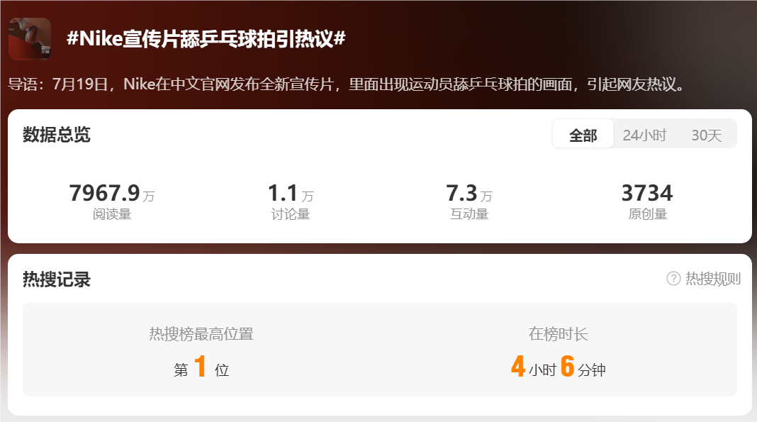 7月19日,Nike在中文官網發佈全新宣傳片,裏面出現運動員舔乒乓球拍的畫面,引起網友熱議,相關話題在23日登上微博熱搜第一。