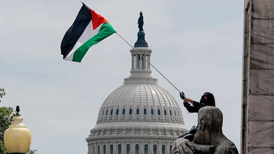 內塔尼亞胡演講遭數千人抗議,美國會附近星條旗被扯下焚燒、換上巴勒斯坦國旗