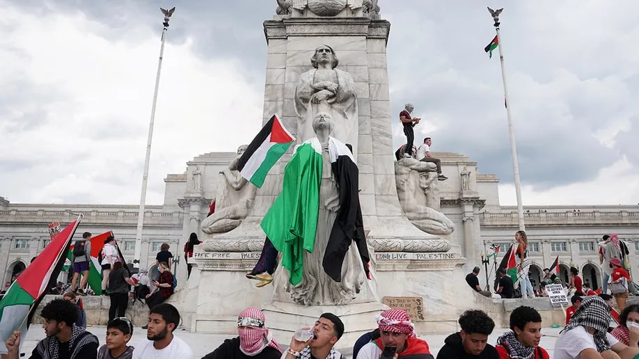 美國《新聞週刊》網站24日稱,抗議活動在下午升級。部分抗議者在華盛頓聯合車站外扯下美國國旗,並用巴勒斯坦國旗“取而代之”。BBC説,抗議者在車站裏意大利航海家克里斯托弗·哥倫布的紀念碑上噴塗塗鴉,有人用大紅噴漆寫下“哈馬斯來了”,綠色噴漆寫下“解放加沙”。