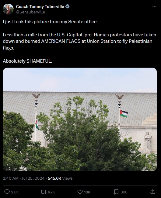 阿拉巴馬州共和黨參議員湯米·塔伯維爾(Tommy Tuberville)曬出自己從辦公室拍到的巴勒斯坦國旗照片,批此舉“絕對可恥”。共和黨人、馬里蘭前州長拉里·霍根(Larry Hogan)則語氣激動地寫道:“這是對每一個手臂上曾戴過國旗併為國捐軀的美國人的侮辱。這令人作嘔,令人不齒。”