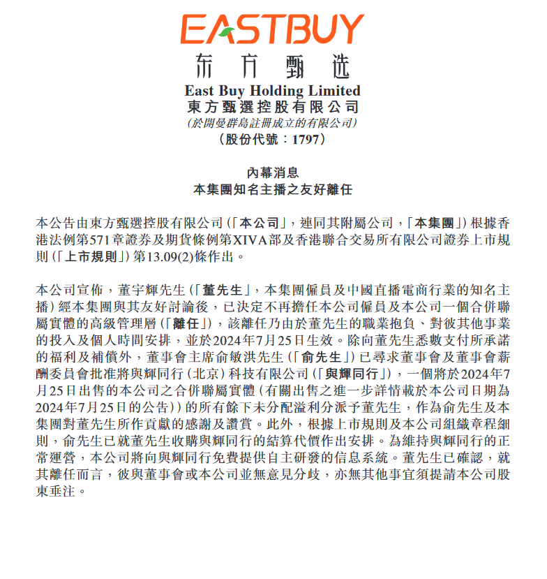 7月25日,東方甄選在港交所發佈公告稱,董宇輝已決定不再擔任該公司僱員及公司一個合併聯屬實體的高級管理層,該離任乃由於董宇輝的職業抱負、對彼其他事業的投入及個人時間安排,並於2024年7月25日生效。