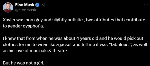 22日當天,馬斯克還在社交平台X上發文稱,威爾遜“出生就是同性戀,有輕微的自閉症,這兩個特徵導致了性別焦慮”。