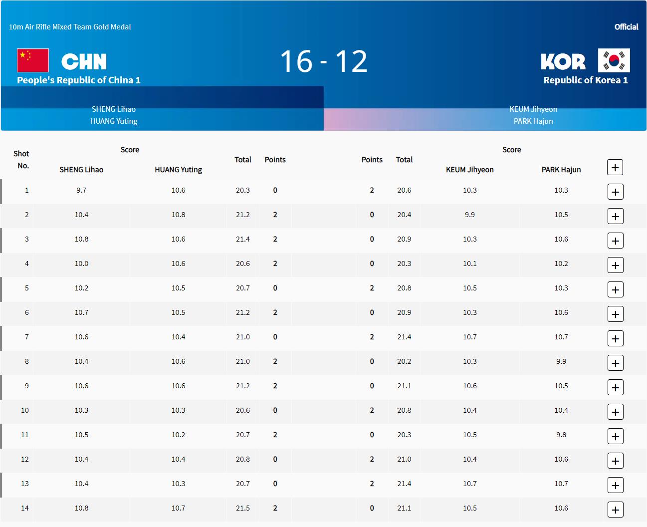 雙方進行了14輪比賽,中國隊最終以16-12拿下巴黎奧運會首金巴黎奧運會官網