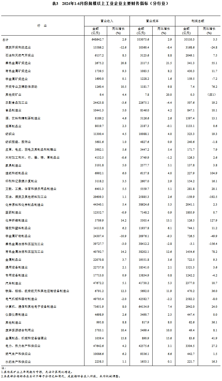 國家統計局:1-6月份全國規模以上工業企業利潤增長3.5%