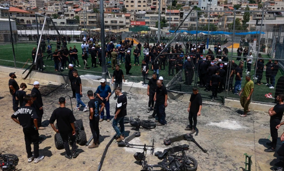 以色列佔領的戈蘭高地城鎮邁吉達爾沙姆斯遇襲後,當地人查看遇襲現場。法新社