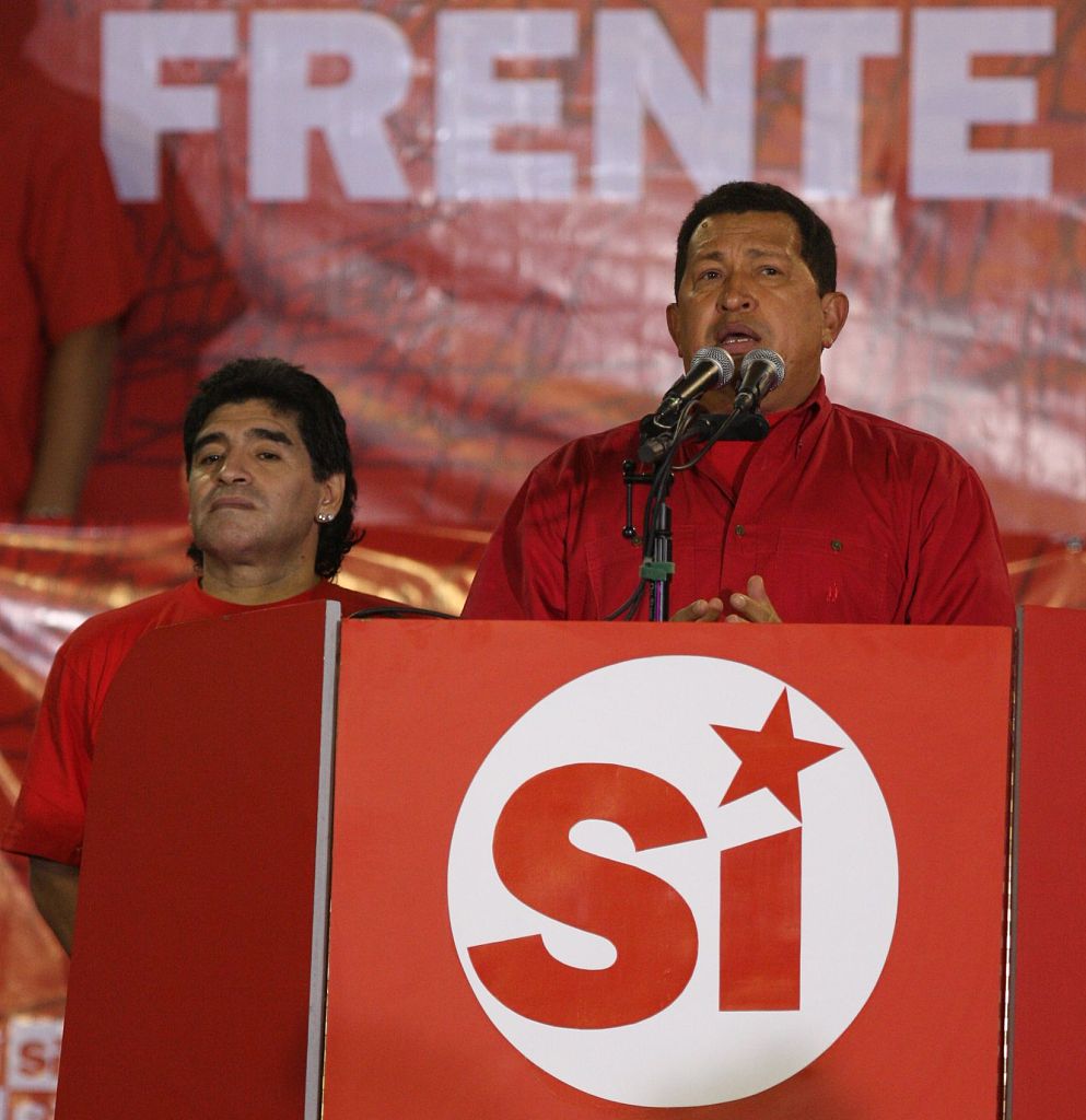2009年1月28日,委內瑞拉總統查韋斯在阿根廷足球明星馬拉多納旁講話視覺中國