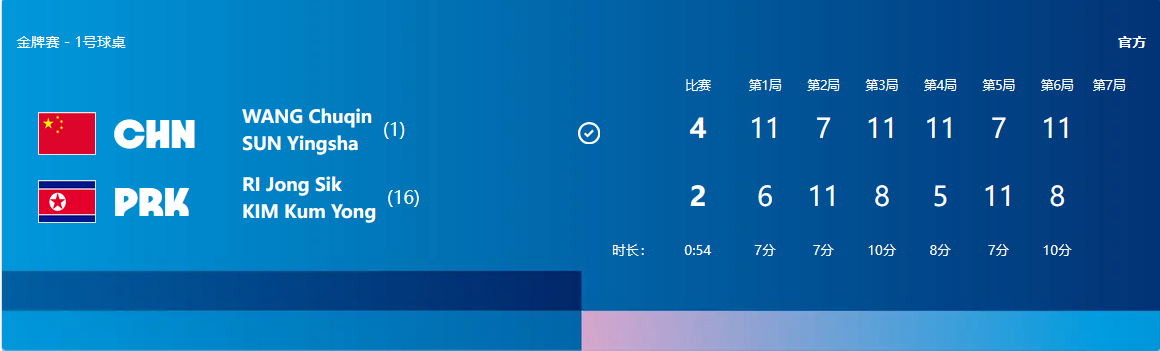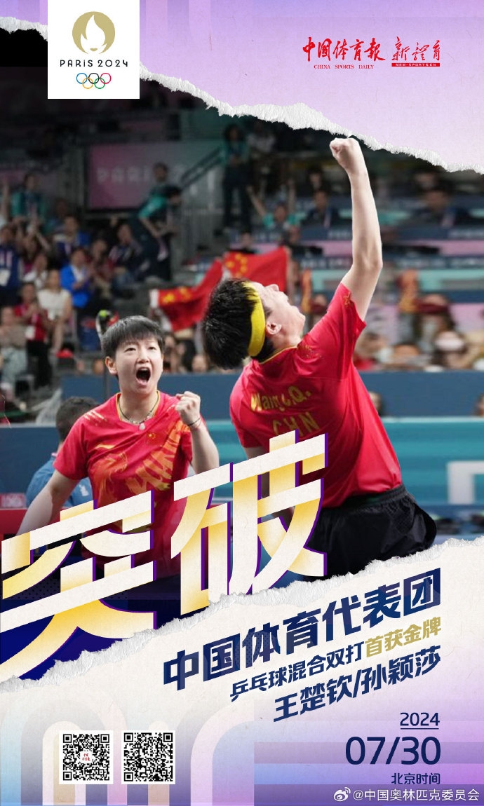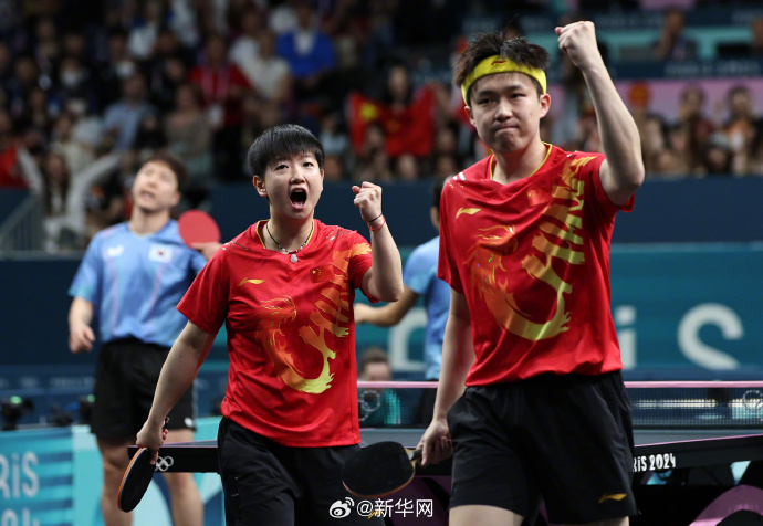 北京時間7月30日晚,在巴黎奧運會乒乓球混合雙打決賽中,中國組合王楚欽/孫穎莎4-2(11-6、7-11、11-8、11-5、7-11、11-8)戰勝朝鮮組合李正植/金琴英,奪得金牌。這是中國乒乓球隊在奧運參賽歷史上的首枚混雙金牌,也是中國體育代表團在本屆奧運會上的第六金。