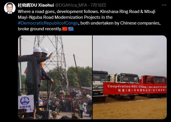 “路在哪裏,發展就在哪裏,”7月18日,在形容中企與剛果(金)的基建合作項目時,中國外交部非洲司司長杜曉輝在社交媒體X平台發佈推文寫道。