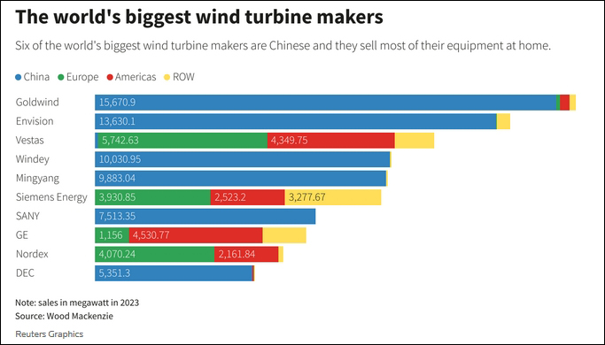 全球最大的風力渦輪機制造商中,有6家來自中國路透社