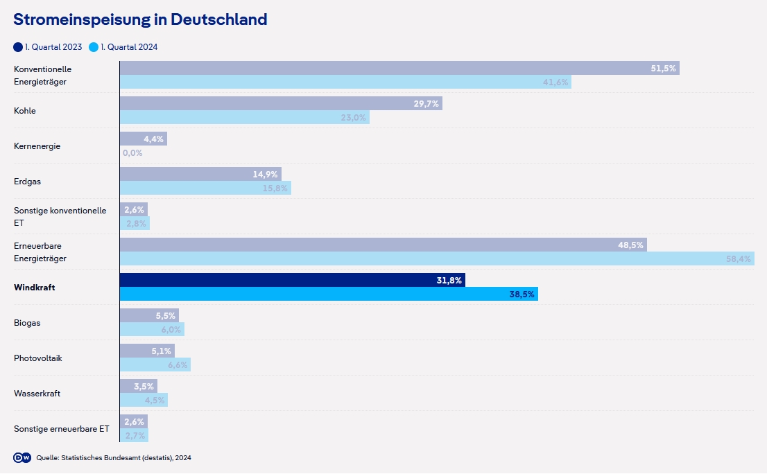 2023年和2023年第一季度德國不同能源發電量佔比,風力發電(Windkraft)增長迅猛“德國之聲”網站
