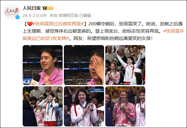 據@人民日報 報道,200蝶奪銅後,張雨霏哭了。她説,發燒之後遇上生理期,感覺身體右邊都是麻的。登上領獎台,她標誌性笑容再現。