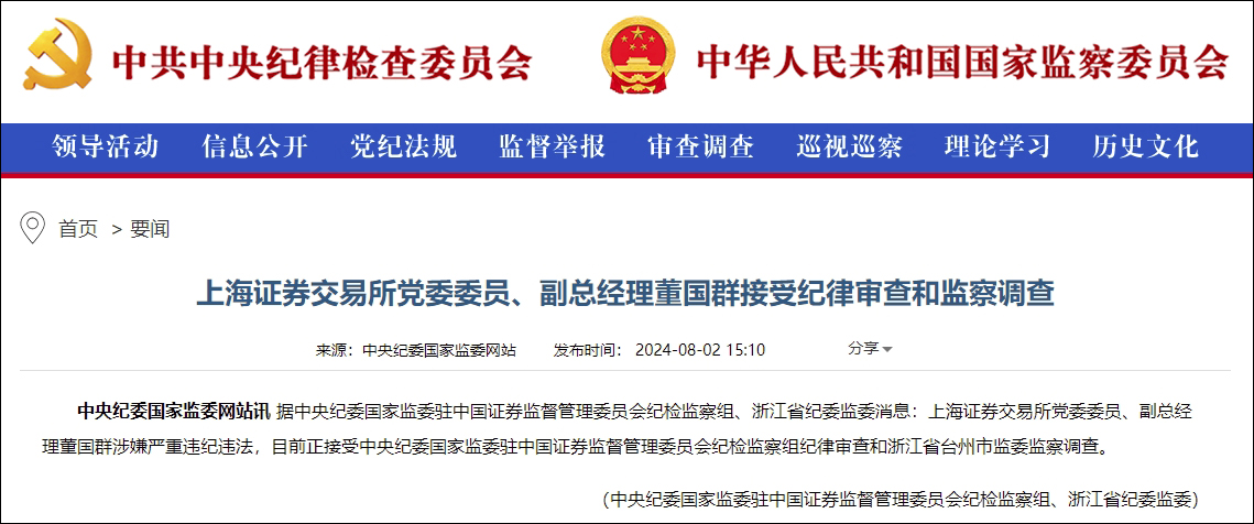 據中央紀委國家監委網站8月2日消息,據中央紀委國家監委駐中國證券監督管理委員會紀檢監察組、浙江省紀委監委消息:上海證券交易所黨委委員、副總經理董國羣涉嫌嚴重違紀違法,目前正接受中央紀委國家監委駐中國證券監督管理委員會紀檢監察組紀律審查和浙江省台州市監委監察調查。