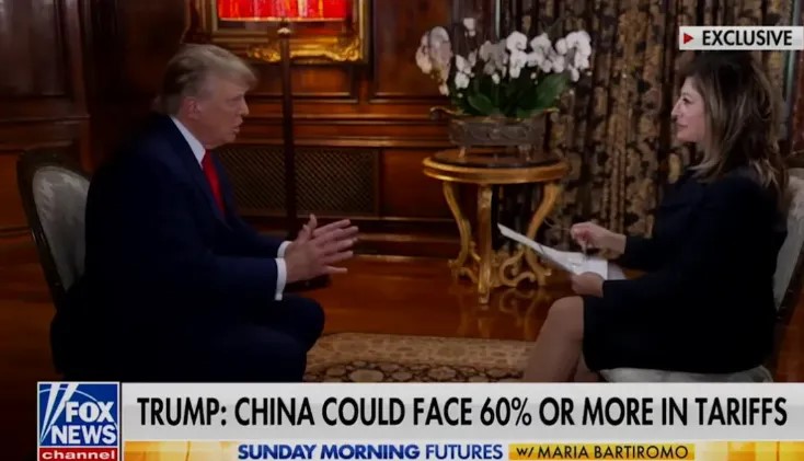 2024年2月4日,特朗普接受福克斯新聞採訪時提出對中國商品加徵60%甚至更高的關税資料圖