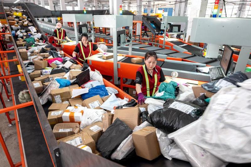△截至6月30日,今年上半年我國快遞業務量突破800億件,比2023年提前59天。圖為2024年6月18日,在浙江湖州市長興縣一家快遞企業,工作人員忙着分揀、掃描出庫等工作。