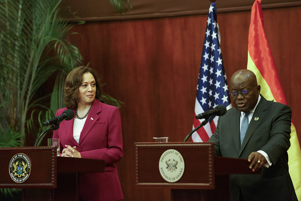 2023年3月27日,加納阿克拉,哈里斯和加納總統納納·阿庫福-阿多出席新聞發佈會。視覺中國