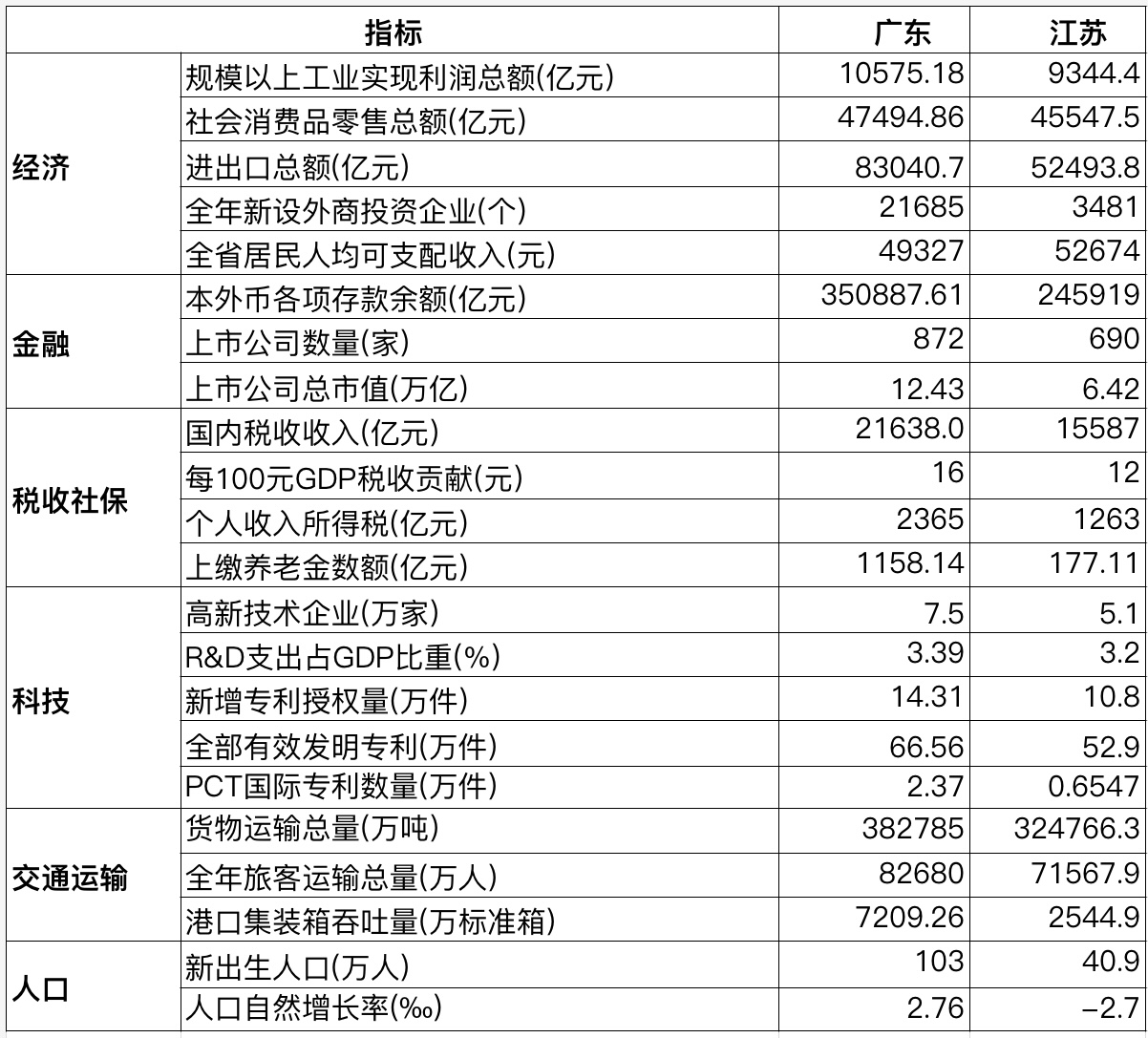 儘管廣東省內發展均衡度不及江蘇,經濟總量優勢也面臨後者的嚴峻挑戰,但作為省域整體,從經濟、金融、税收、科技、交通運輸、人口等多方面關鍵指標來看,目前廣東的綜合實力仍更勝一籌。或者説,即便經濟總量相若,廣東的單位GDP“含金量”也高於江蘇。