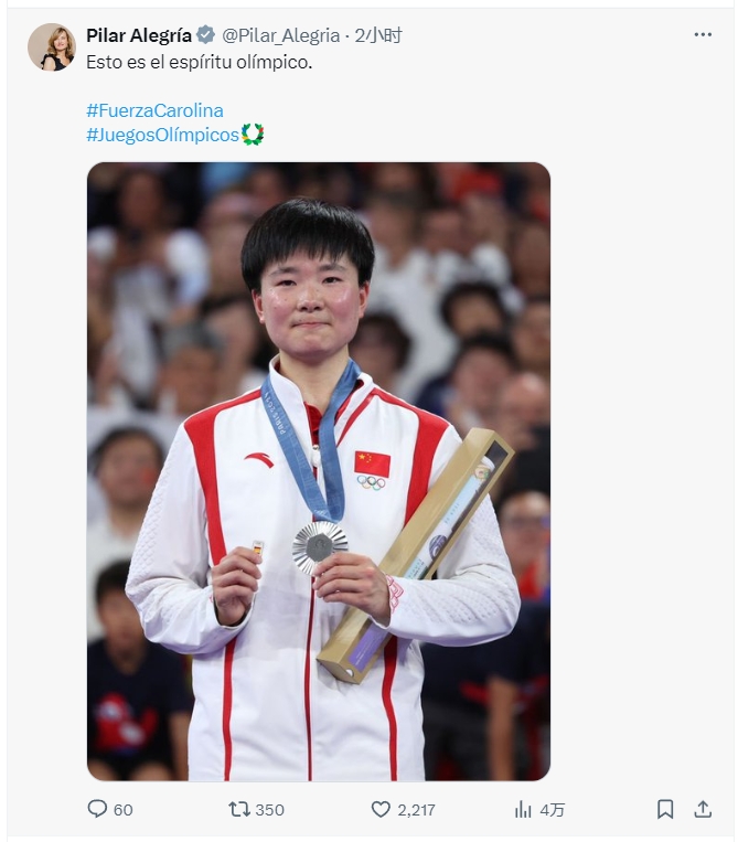 對此,西班牙教育與職業培訓大臣皮拉爾·阿萊格里亞(Pilar Alegría)在社交平台上單發了何冰嬌的領獎照片,並稱“這就是奧林匹克精神”。