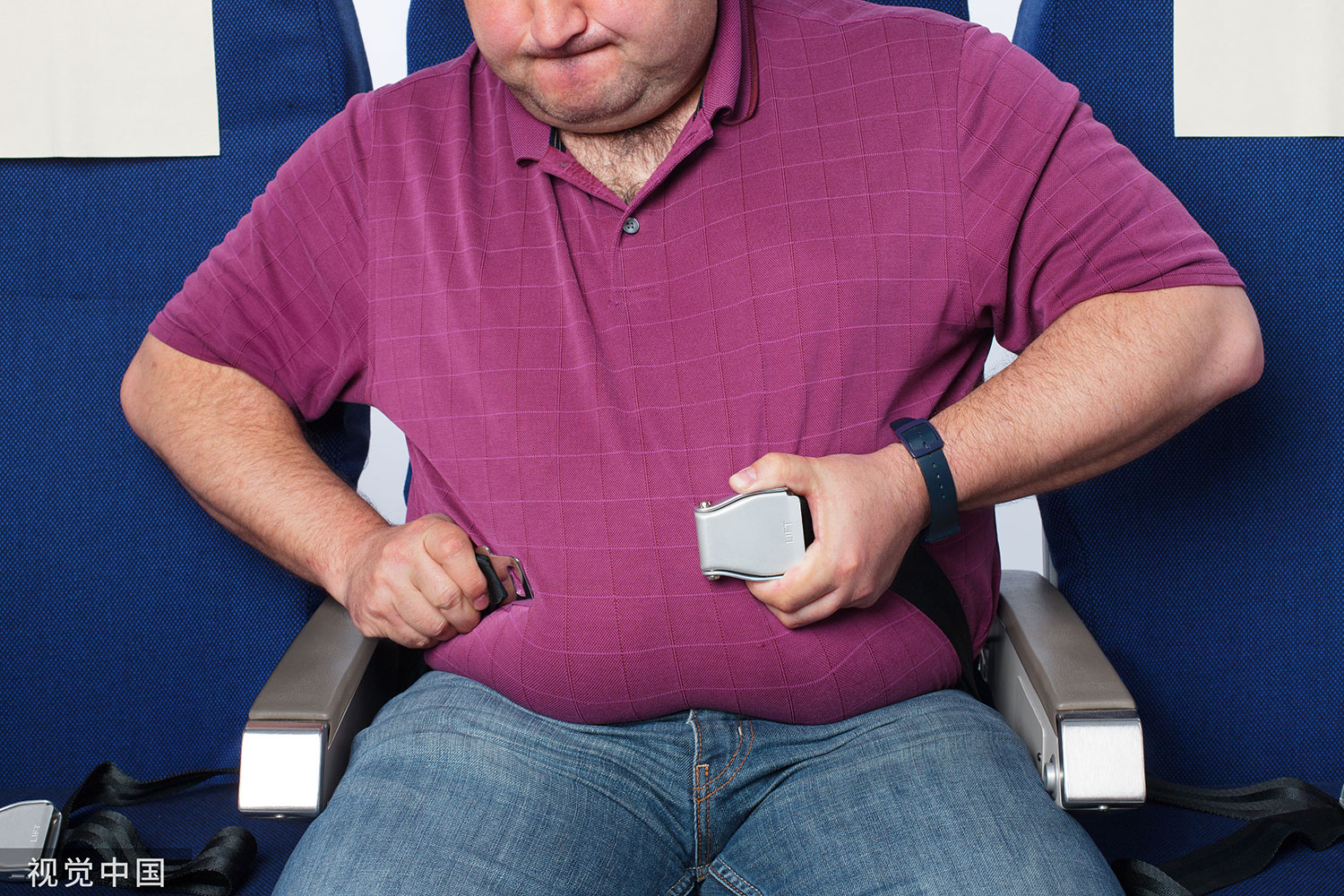 一名肥胖人士在機艙座位上吃力地扣安全帶